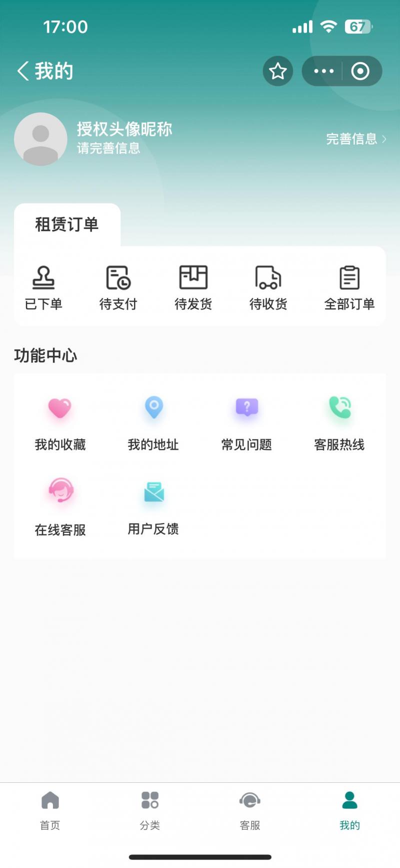功能清单:实名认证、信用免押、商品分类、优惠券、积分、订单进度查询、在线客服等功能