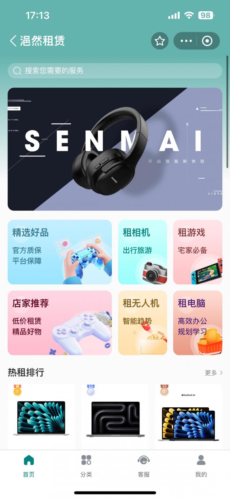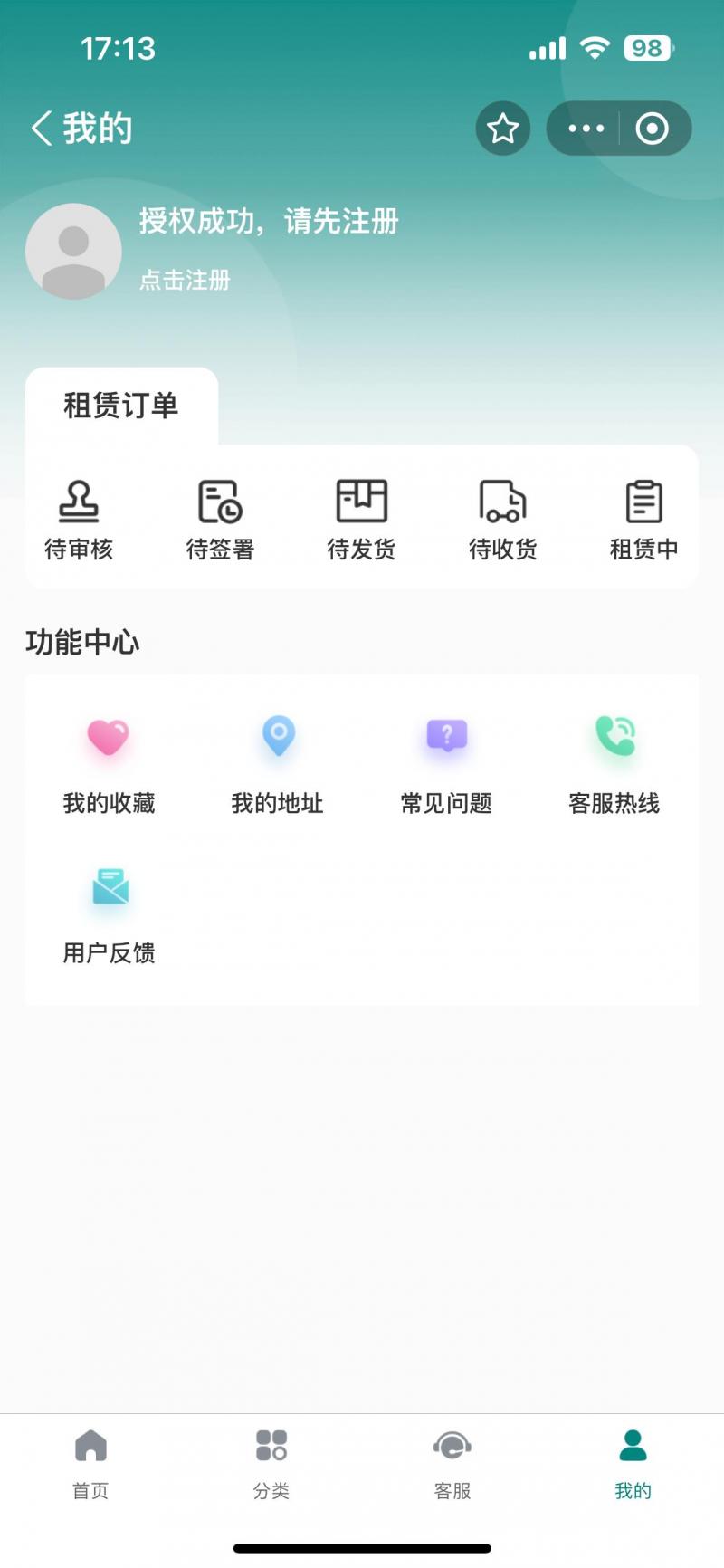 功能清单:实名认证、信用免押、商品分类、优惠券、积分、订单进度查询、在线客服等功能