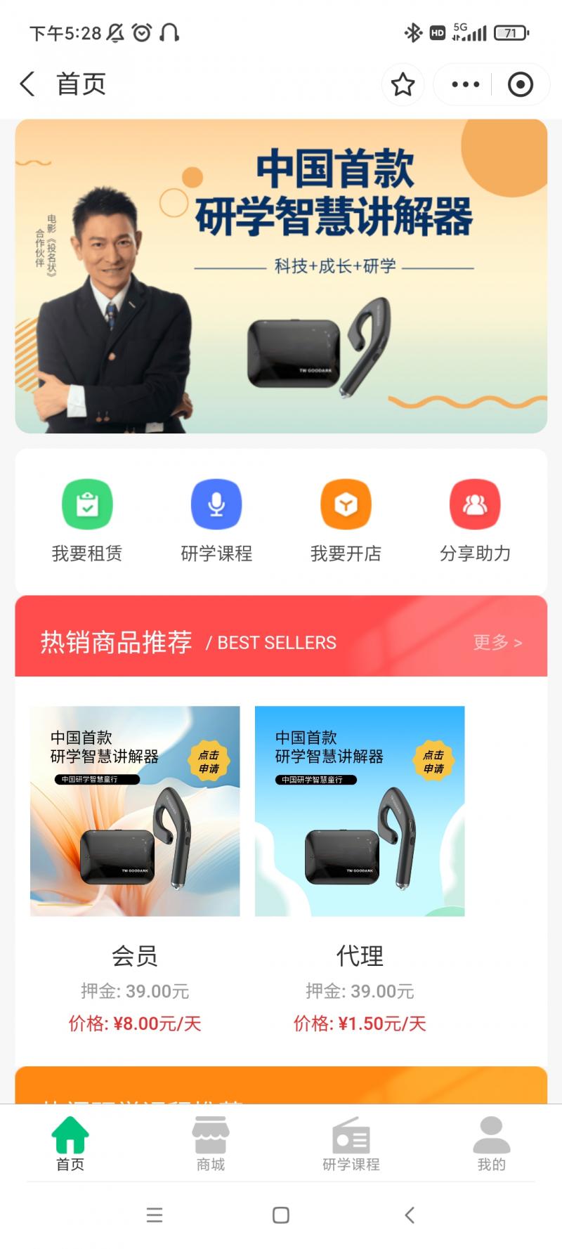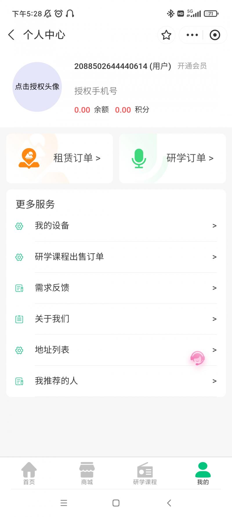 功能清单:授权登录、租赁订单、研学订单、我的设备、需求反馈、地址列表、我推荐的人等功能