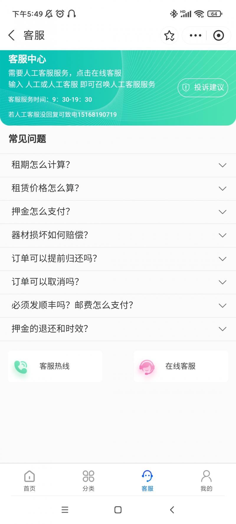功能清单:实名认证、商品分类、租赁订单进度查询、商城订单进度查询、常见问题、在线客服等功能