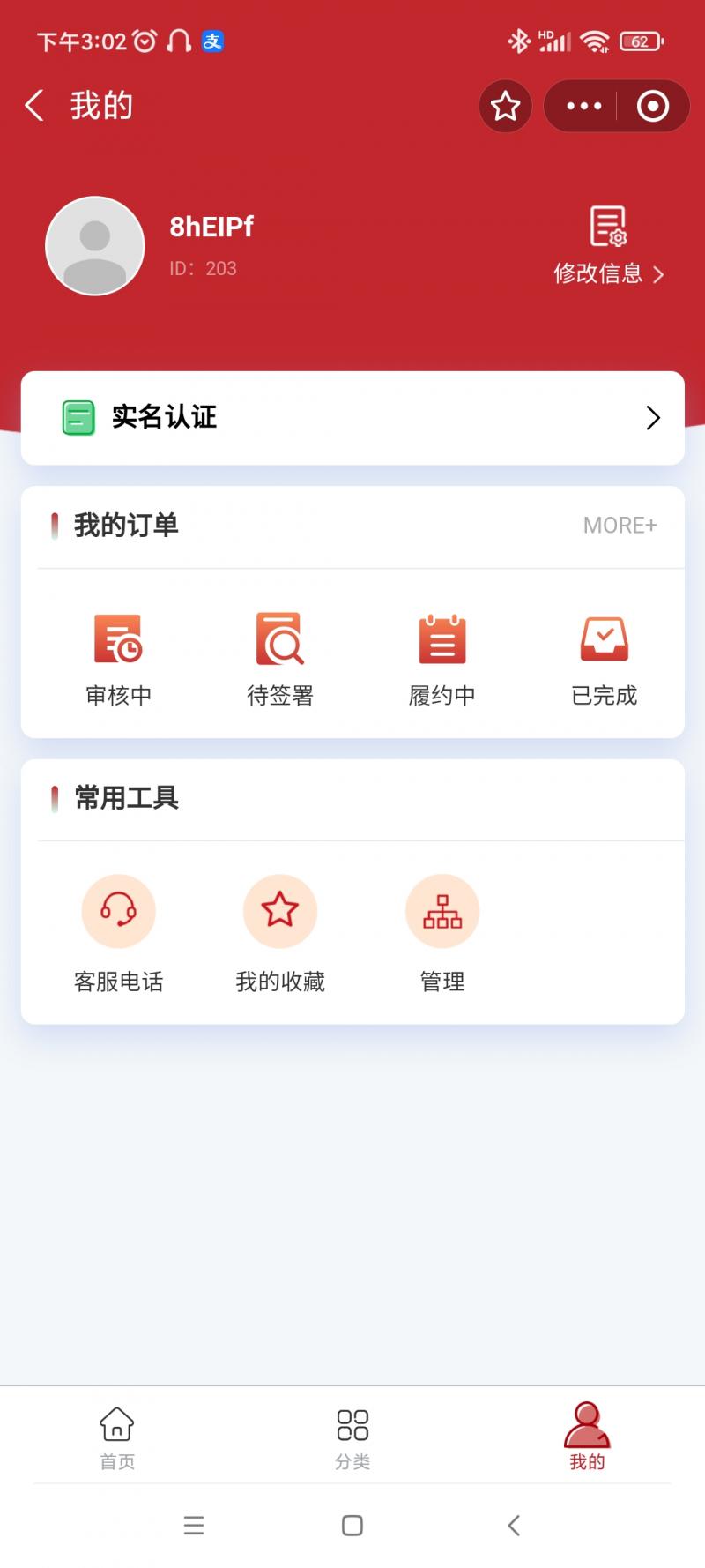 功能清单:实名认证、商品分类、订单进度查询、在线客服等功能